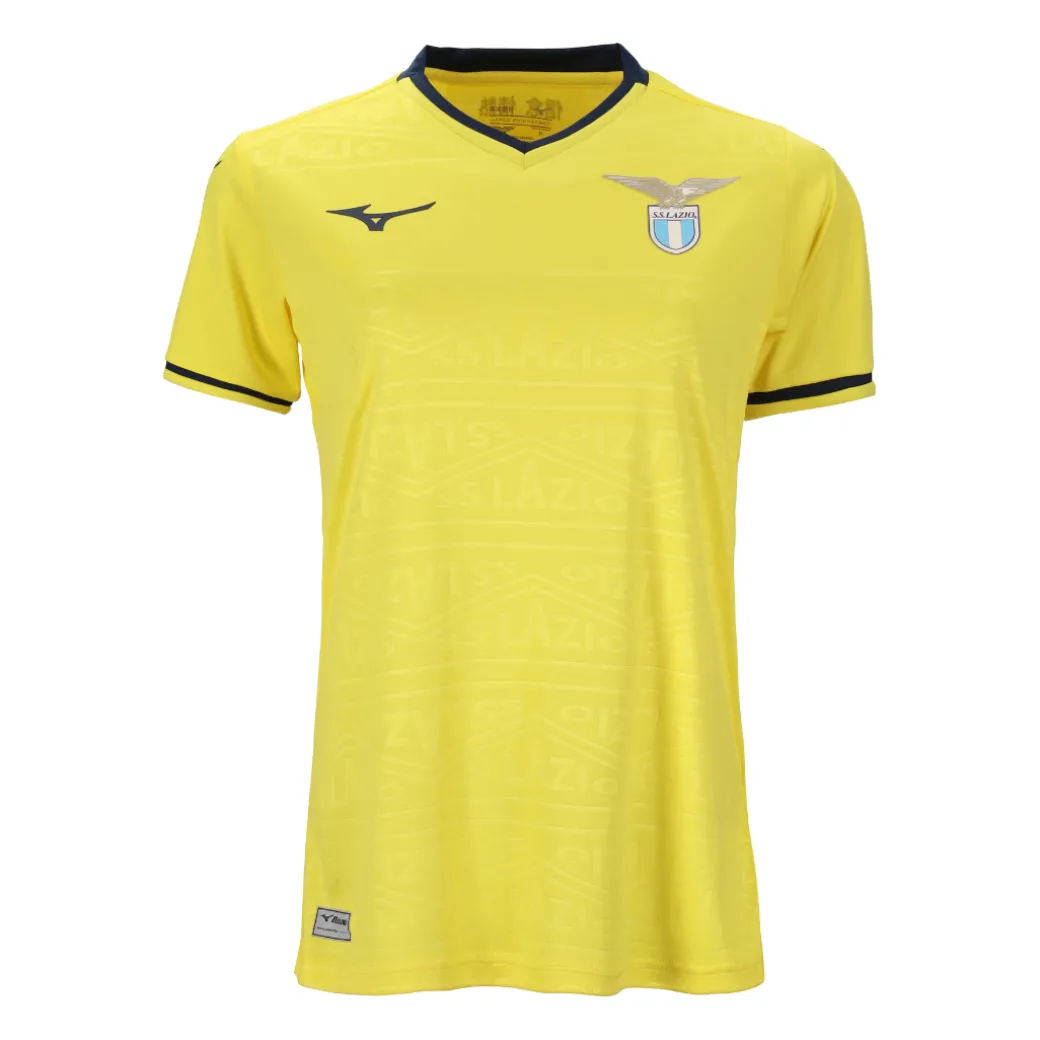 The Lazio 24/25 Away kit by Mizuno draw inspiration from different iconic kits worn by the Club during the 90s, revisited in a modern way. Featuring embossed S.S LAZIO lettering within a geometric pattern, self fabric V neck and cuffs with white and navy contrast. The Japanese back signoff translates One faith, one passion, an important saying of the Club, in order to bring together the heritage of the brand with that of the Club.